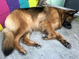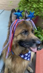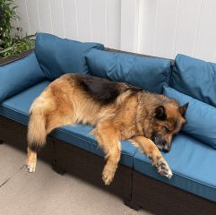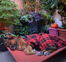In the middle we see her taking a sun bath. Skyler and her littermates just turned 7 years old not too long ago. We wish them the very best and many more healthy years  |