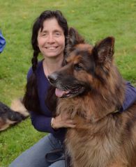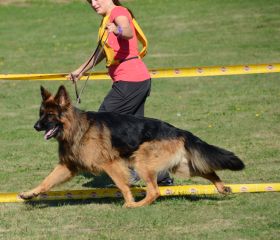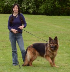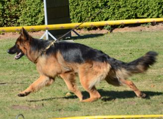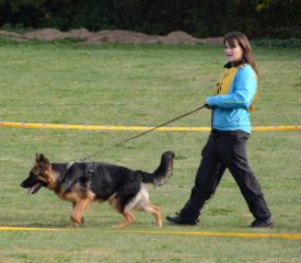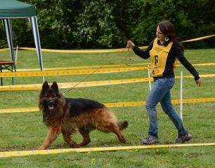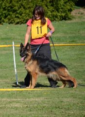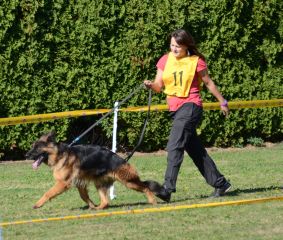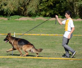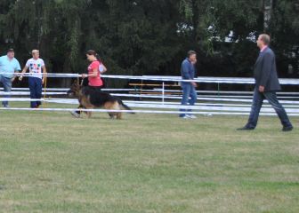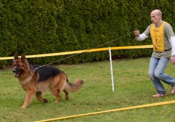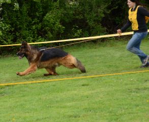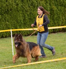 Now Dagmar, the owner, has to run with him one round without a leash. Tabaluga has to heel during this time. At the SV shows this is one of the requirements in "working class". |
