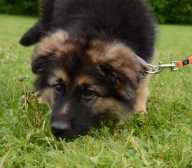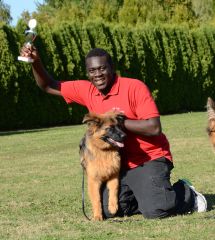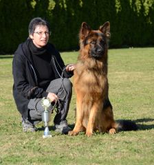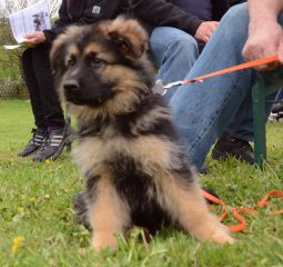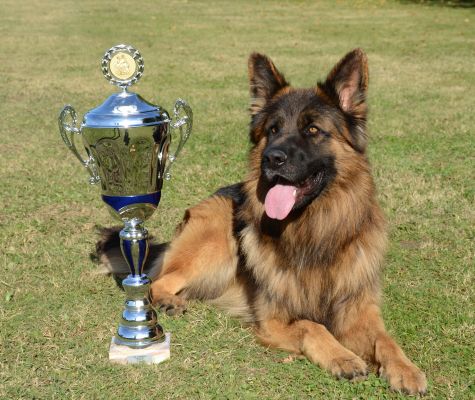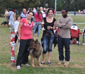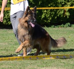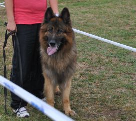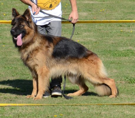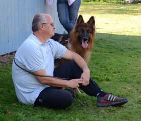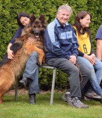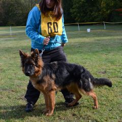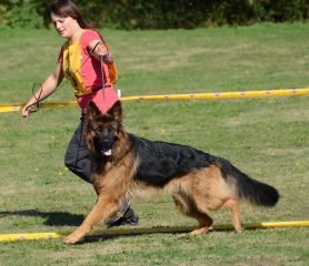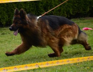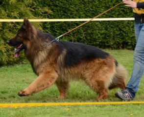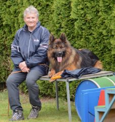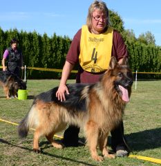 At this show he came in 1st place in the highest class "the breeding class" and this is a great success with the age of 2 years. He is an extreme big and tall male with very good proportions as you see on these above pictures. His blood line speeks for itself. Not only he is successful, also his sister "Nixe" and his other litter mates, who had been achieved titles in the past as well. He is a very proud dog. Hundemama will try to pass with him IPO 2 (SchH 2) this winter. |