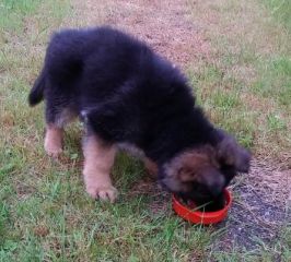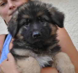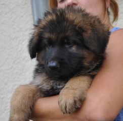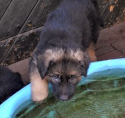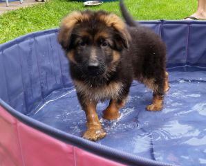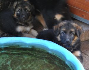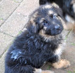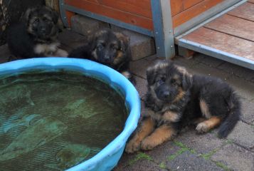 Note: All of these puppies are extremely big for their age and also heavy. We gave out to every new puppy owner a handling and feeding table. Please follow the advices, especially when it comes to the weight schedule. Again and again we notice - like on our hike yesterday -, that people still feed their dogs too much and the dogs weigh more what they should weigh. Please weigh your puppy as soon as you receive it and do not forget, that your puppy is not supposed to gain more then 2.2. pounds each week and keep him or her under the recommended weight for each week as it states in our feeding table. This is very important, so the puppy grows very slowly in the first year. We urge you to follow our advices, also when it comes to changing puppy food into adult food and at what age. Please read our handling and feeding table very carefully!  |