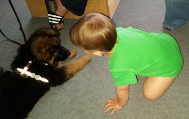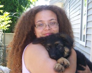 Trisha has just arrived on that picture and she is doing so well and being so friendly to this "stranger". This shows how important it is, that the puppies get as much human contact as they can get in the first 8 weeks of their lifes  |