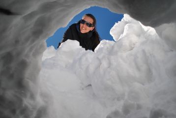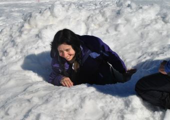 Cheyenne finds it amusing , how her master tries to crawl out of the cave |